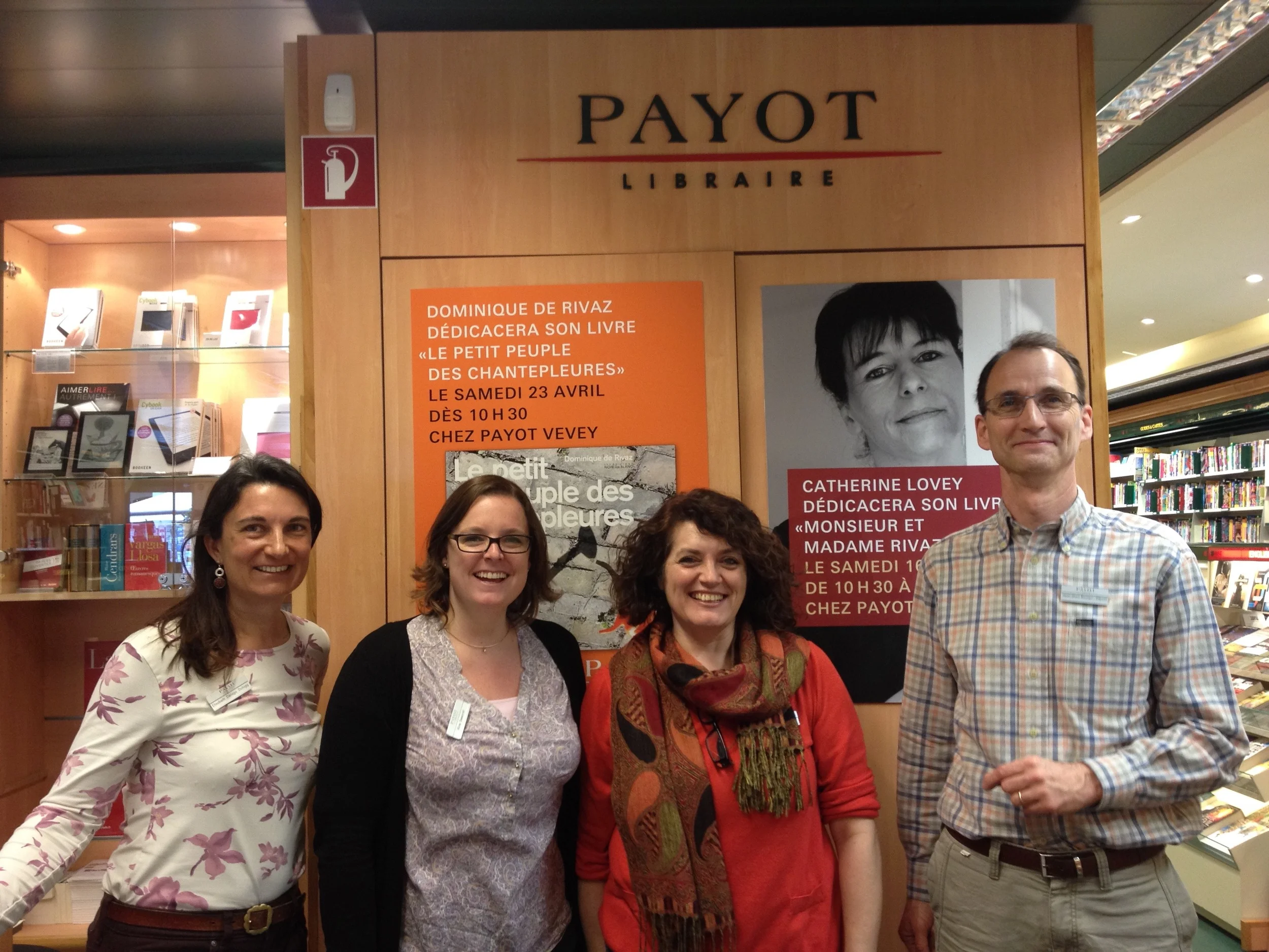 Merci à toute l'équipe de Payot Vevey pour leur accueil si chaleureux. De g. à d. Élisabeth Defago-Duhigg, Aline Dewarrat, Giuseppa Furnari et Jean-Marc Bourqui, gérant. Merci aussi à Olga Nicolerat et à Germain Junod, absents au moment de la photo.